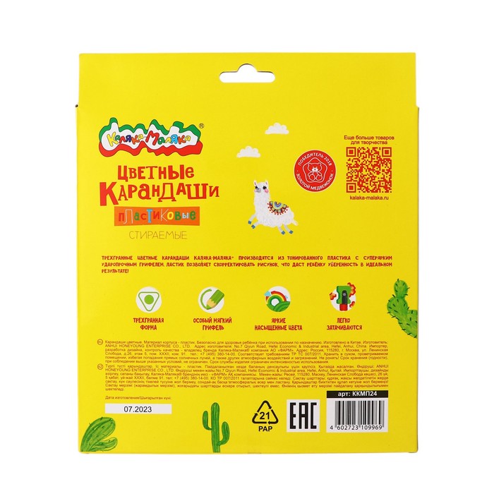 Карандаши цветные 24 цвета «Каляка-Маляка» СТИРАЕМЫЕ, с ластиком, трёхгранные, пластиковый корпус — Характеристики