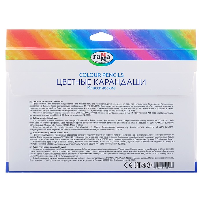 Карандаши цветные 36 цветов «Гамма. Классические», шестигранные, d=2.6 мм, картонная упаковка, европодвес 050918_05 — Характеристики
