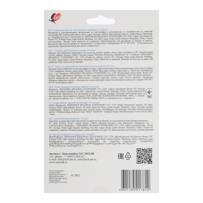 Карандаши цветные 36 цветов, «Луч. Классика», шестигранные — Характеристики