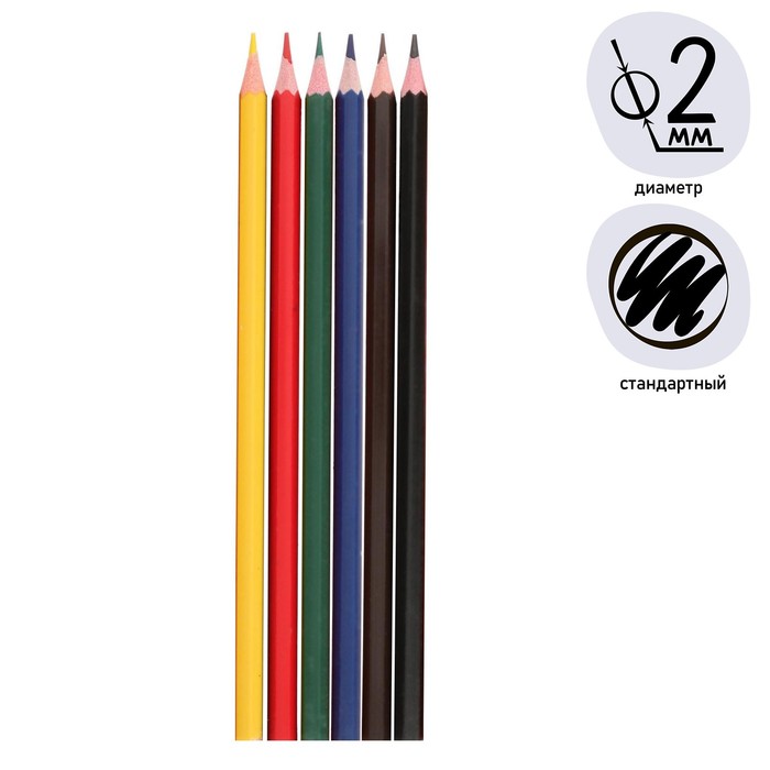 - Набор цветных карандашей бюджетной ценовой категории, 6 цветов, стандартный средней жесткости грифель.