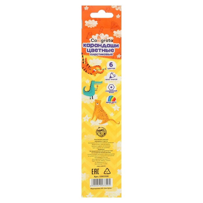 Карандаши цветные 6 цветов Calligrata, ЭКОНОМ, заточенные, шестигранные, пластиковые, картонная упаковка, европодвес — Характеристики