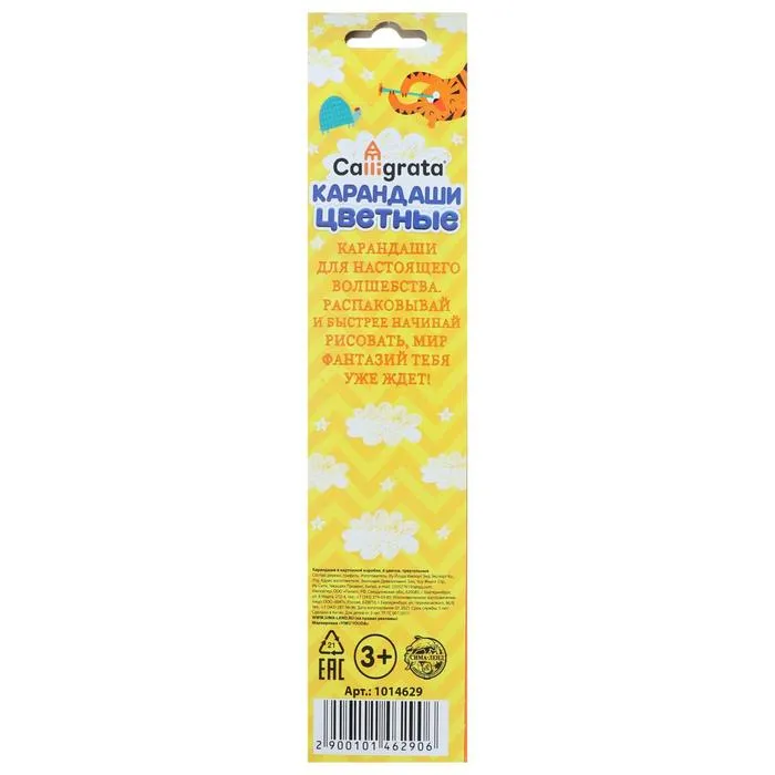 Не токсичны и абсолютно безопасны.Набор состоит из 6 цветов.Яркие цвета развивают цветовосприятие ребенка.Они изготовлены из древесины ценных пород и имеют лакированный корпус.Мягкий грифель обладает повышенной прочностью, не ломается и не крошится при заточке.Все карандаши заточены и поставляются в цветной картонной коробке.Цветные карандаши позволят юным художникам выразить свои мысли и эмоции в красивых рисунках.