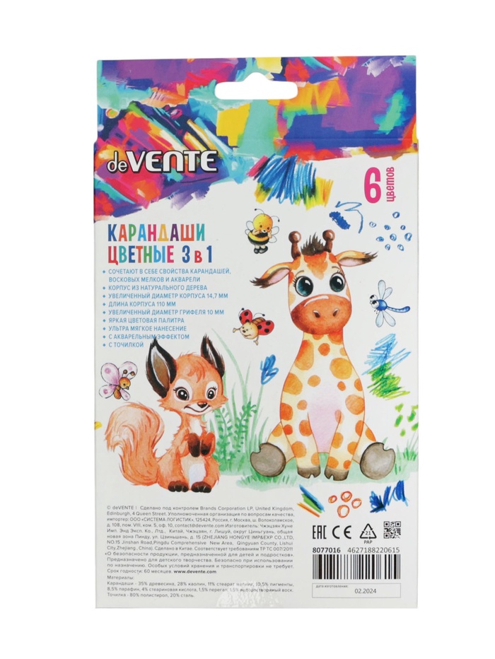 Карандаши цветные акварельные 6 цветов, мини deVENTE Jumbo 3 в 1 супер мягкие, d=14.7 мм; L-110 мм с точилкой — Характеристики
