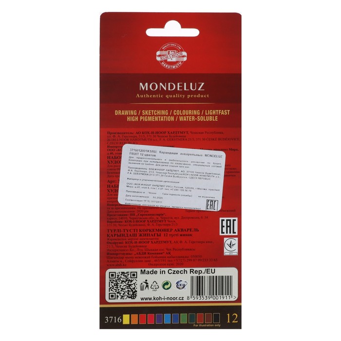 Карандаши цветные акварельные набор 12 цветов, Koh-I-Noor Mondeluz 3716 — Характеристики