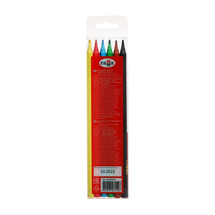 Цветные пластиковые карандаши "ГАММА" серии "Мультики" выполнены в стильном шестигранном корпусе из высококачественного пластика. В наборе 6 цветов: желтый, красный, зеленый темный, светло-голубой, темно-коричневый, черный. Диаметр грифеля – 3 мм. Проклеенный ударопрочный грифель не крошится во время заточки и не ломается даже после падения. Корпус карандаша диаметром 7 мм и длиной 174 мм изготовлен из пластика. За яркость и высокую укрывистость отвечают качественные пигменты в составе. Ребенку не придется сильно давить на карандаш – рисунок получится ярким и равномерно закрашенным. Упаковка – пластиковая коробка с европодвесом.