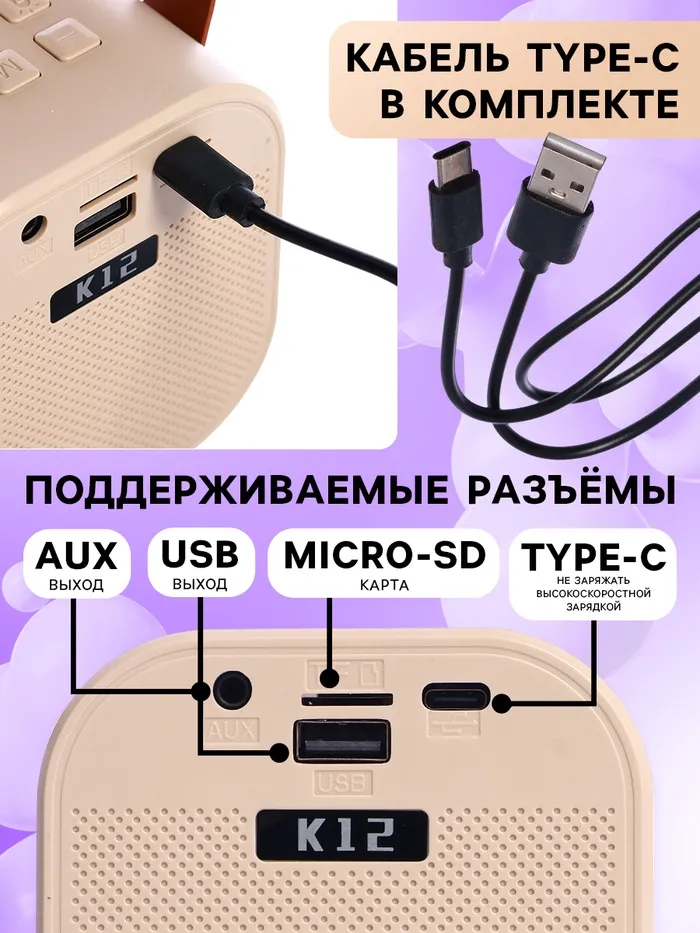 Детское караоке с двумя беспроводными микрофонами — это отличный выбор для весёлых семейных вечеров и праздников. Встроенные звуковые эффекты, подсветка и функция изменения голоса добавят разнообразия, а удобное подключение через Bluetooth, USB и AUX обеспечит универсальность.