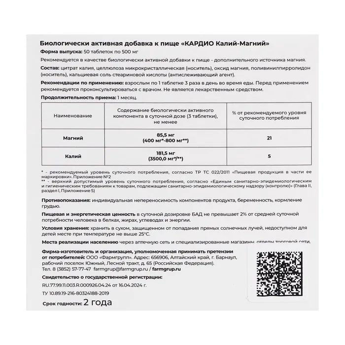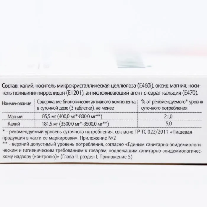 Состав: калий, носитель микрокристаллическая целлюлоза (Е460i), оксид магния, носитель поливинилпирролидон (Е1201), антислеживающий агент стеарат кальция (Е470).