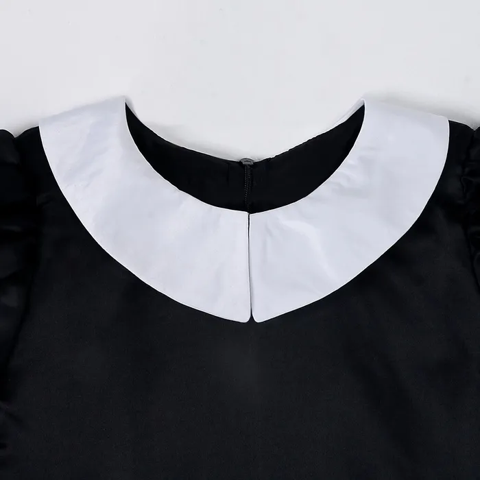 • Платье: — элегантное чёрное платье из атласа и полиэстера с белым воротником, который придаёт образу нотку строгости и изысканности. Талию подчёркивает стильный белый бант.
