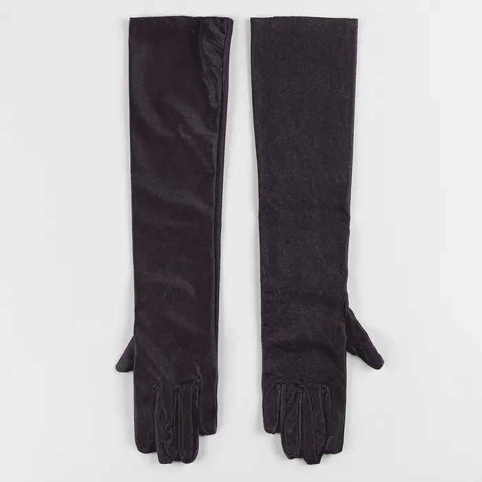 Чёрные эластичные перчатки — акцентный аксессуар для создания эффектного образа на любой тематической вечеринке. Они идеально подойдут для ладони среднего размера. Благодаря эластичной ткани перчатки плотно надеваются на руки, обеспечивая комфорт и свободу движений.
