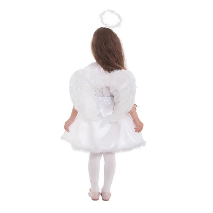 Платье выполнено из атласа, крылья на резинке. Нимб, горловина платья и низ изделия дополнены лебяжьим пухом.