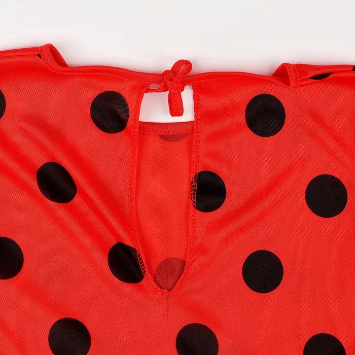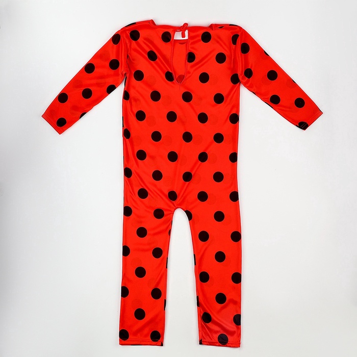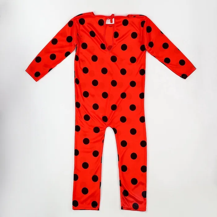 - Комбинезон: Удобный и яркий комбинезон, выполнен в классических цветах божьей коровки — красный с чёрными точками. Застёгивается сзади на завязки для удобства.