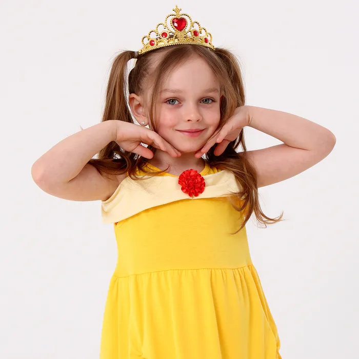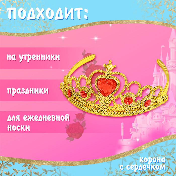 - Очаровательная корона, украшенная сверкающими камнями и нежным сердечком, станет завершающим штрихом в образе юной принцессы. Она надежно фиксируется на голове и не доставит дискомфорта.