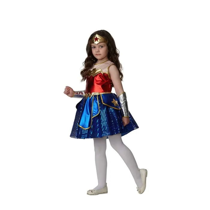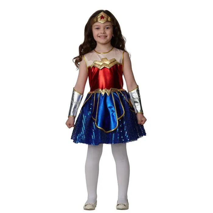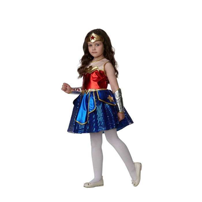 Карнавальный костюм «Чудо-женщина», платье, нарукавники, головной убор, р.32, рост 128 — Характеристики
