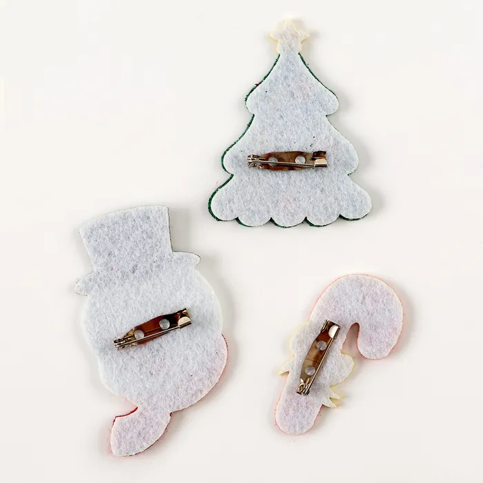 - Набор из трёх ярких брошей с новогодней тематикой. Их можно прикрепить к платью или шапке для создания индивидуального образа.