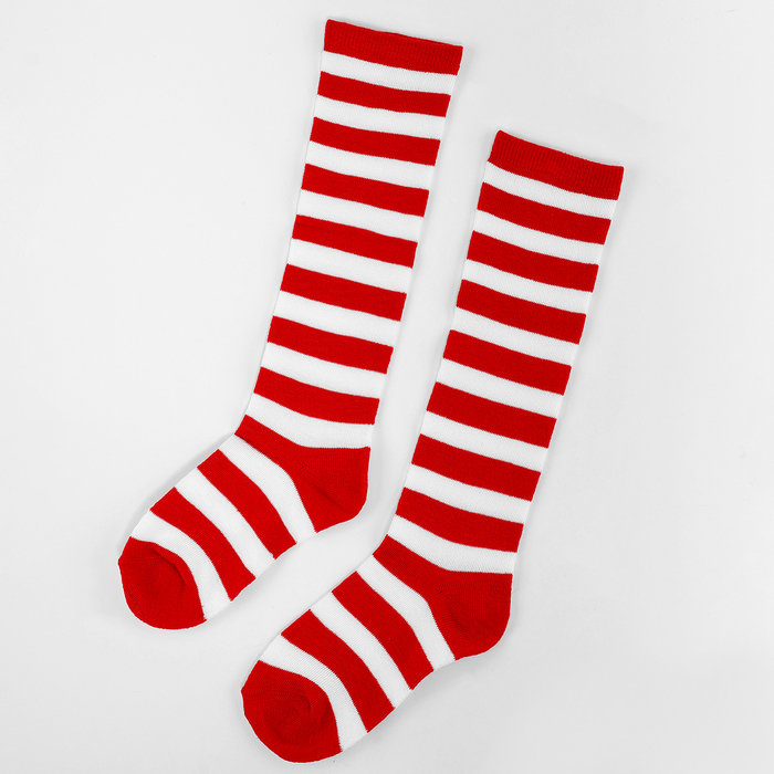 - Теплые и мягкие гольфы в красно-белую полоску. Они отлично сочетаются с платьем и создают завершенный образ.