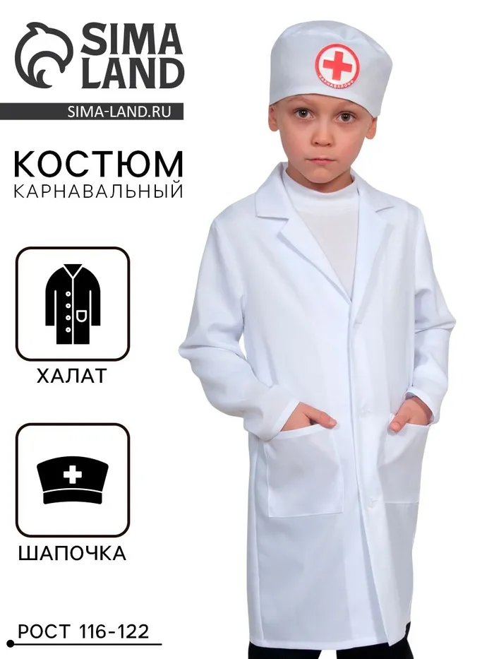 Карнавальный костюм «Доктор-2», халат, шапочка, р-р S, рост 116-122 см — Характеристики