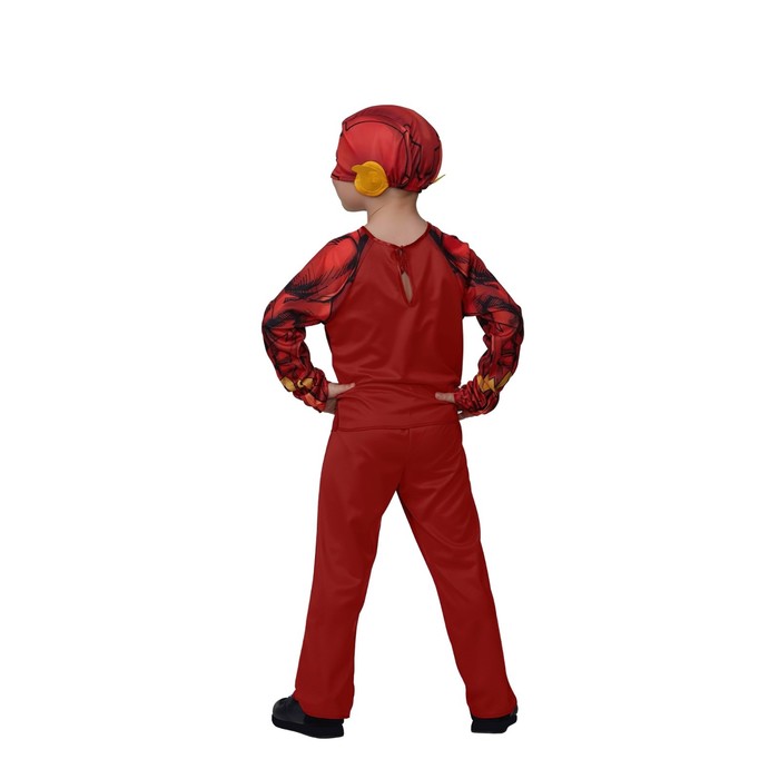Красочный костюм, вдохновленный персонажем Флэша из комиксов, станет отличным выбором для разных праздников и мероприятий. Костюм выполнен в красно-желтой цветовой гамме, привлекающей внимание своей яркостью и оригинальностью. На материале нанесен рисунок, имитирующий мускулы, а на груди изображен знаменитый логотип в виде молнии.