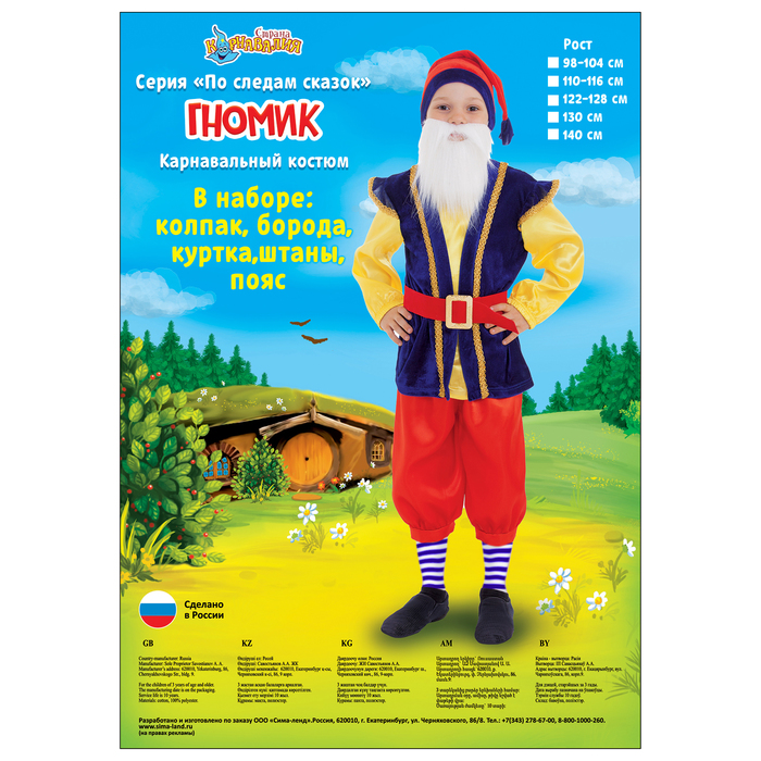 Карнавальный костюм «Гном», колпак, борода, рубашка, пояс, штаны, башмаки, р. 30, рост 122 см