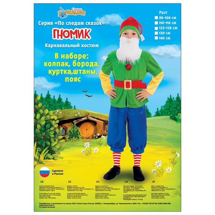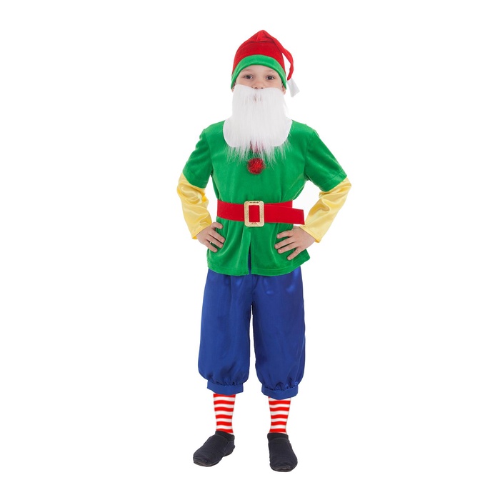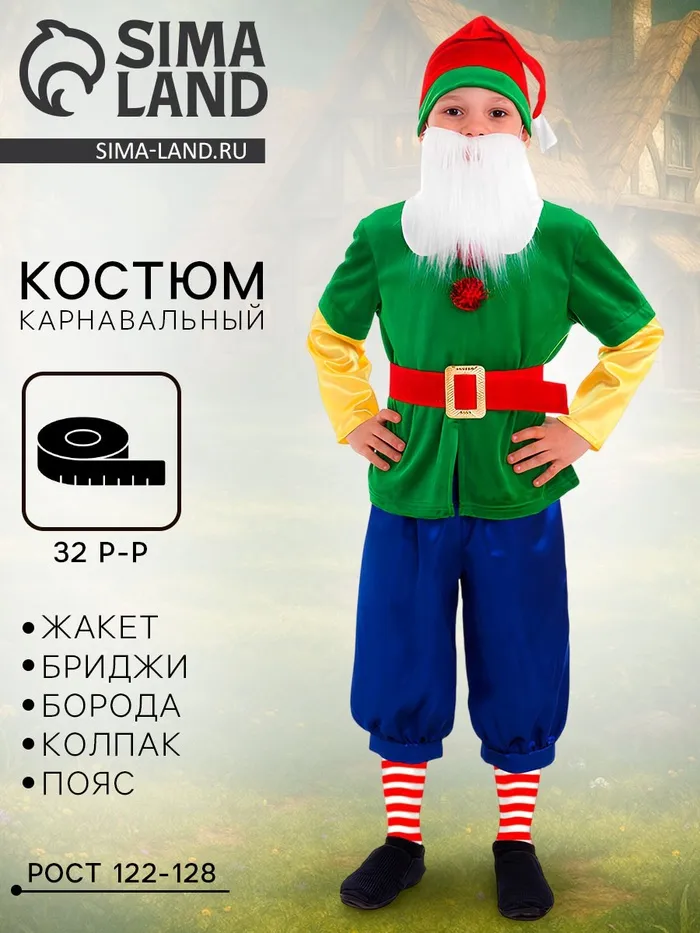 Карнавальный костюм «Гном зелёный», колпак, жакет, бриджи, борода, пояс, р. 32, рост 122-128 см — Характеристики