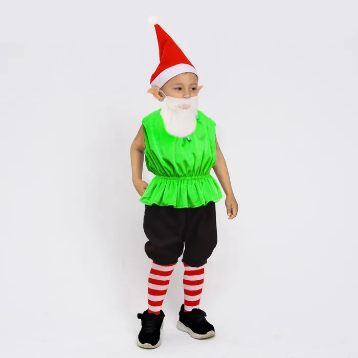 Карнавальный костюм «Гномик Кузя» жилет на кулисе, бермуды, борода, колпак, уши, гольфы, р-р 32, рост 122 см — Характеристики