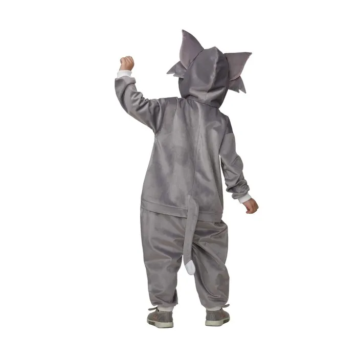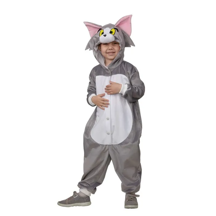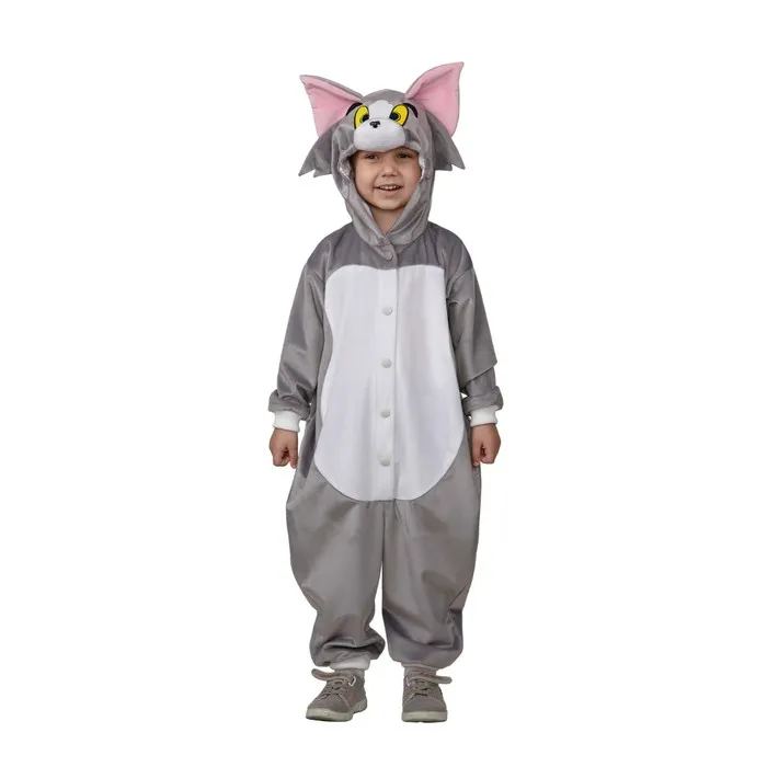 Карнавальный костюм «Кот Том» выполнен в виде пижамы-кигуруми. Такой фасон очень практичный и удобный. Носить изделие можно ежедневно дома или надевать на праздничные мероприятия. Наряд выглядит уместно и гармонично сочетается с другой одеждой или аксессуарами.
