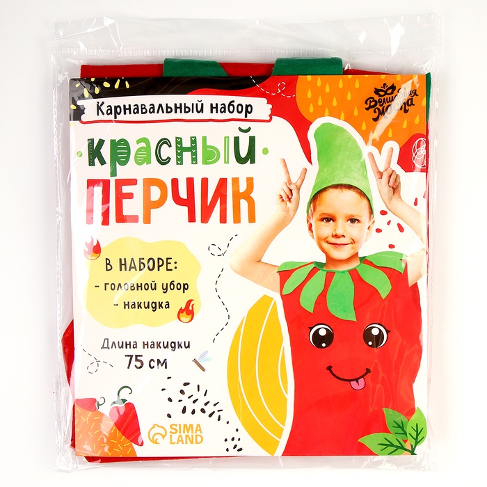 С набором «Красный перчик» ваша малышка станет настоящей звездой на детской вечеринке и поразит всех гостей! С ним вы составите полноценный образ, ведь в комплекте есть накидка и головной убор. Создавайте яркие эмоции и воспоминания на целый год вперёд себе и ребёнку!