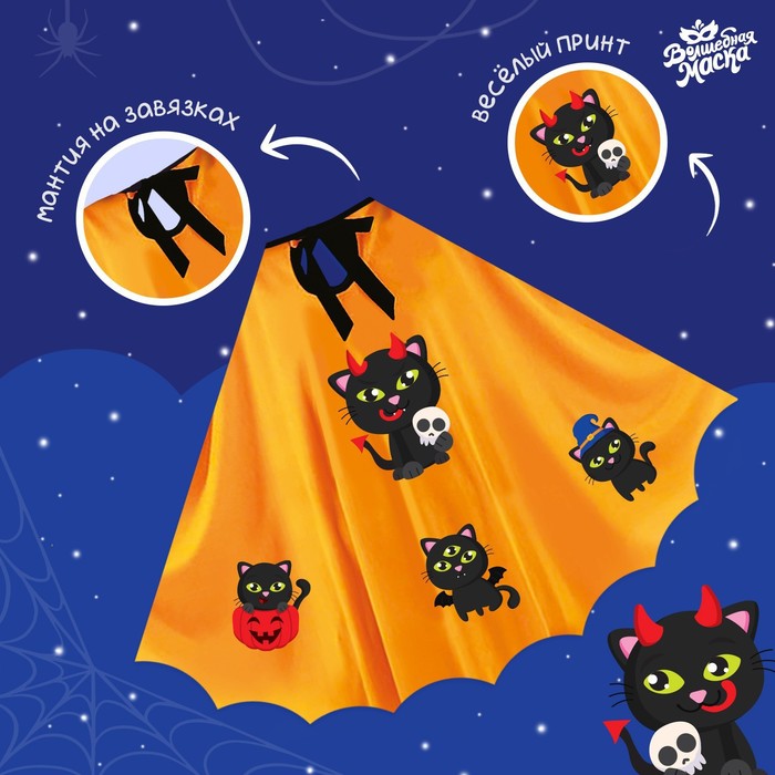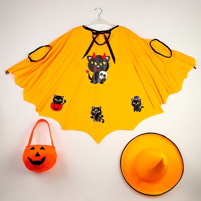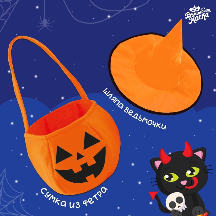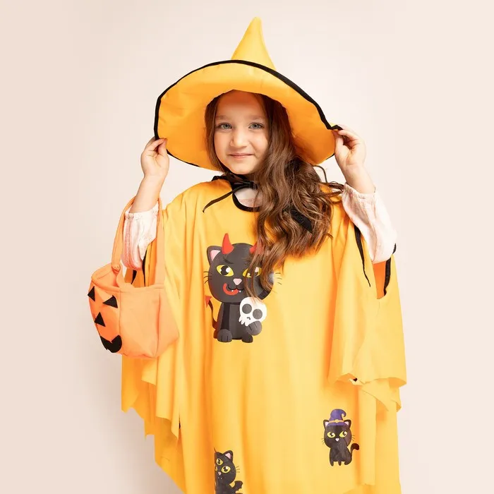 Карнавальный костюм на хэллоуин «Сладость или гадость?»: накидка, шляпа, сумка, оранжевый — Характеристики