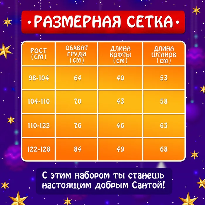 Идеально подходит для новогодних утренников, детских праздников и тематических вечеринок. Ваш ребенок с удовольствием перевоплотится в доброго Санту и окунется в атмосферу волшебства.