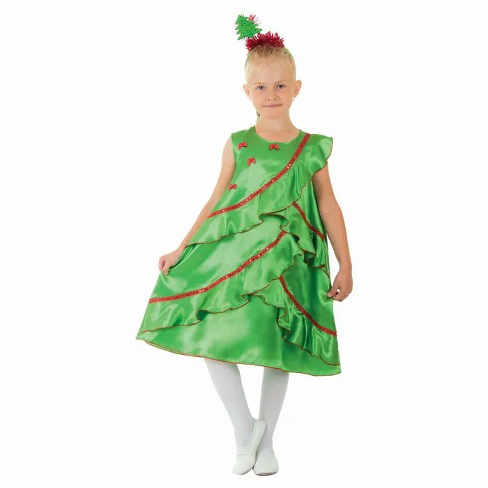 Карнавальный костюм новогодний «Ёлочка атласная», платье, ободок, р-р 28, рост 104 см сделает вашу малышку самой нарядной на любом празднике! Яркое платье расшито красной тесьмой. Креативный ободок с фигуркой хвойного деревца дополнит зимний образ и украсит причёску.