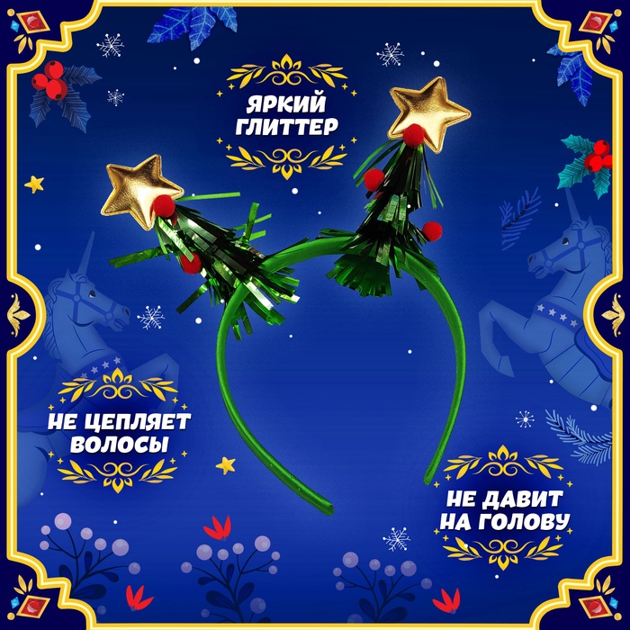 - Ободок: Яркий зелёный ободок украшен двумя ёлочками с золотыми звёздами. Ободок надёжно фиксируется на голове и не доставляет дискомфорта.