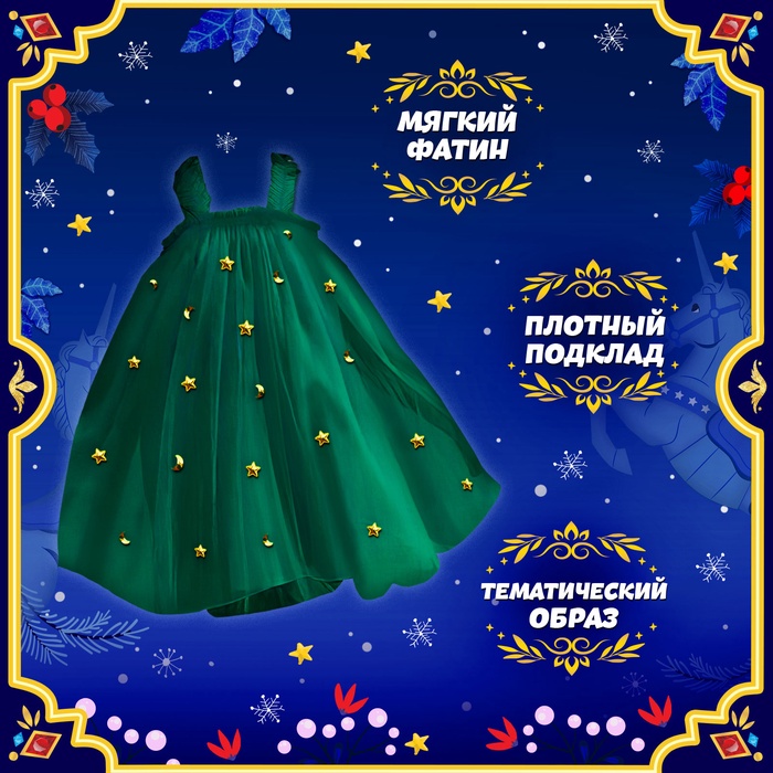 - Платье: Пышное платье изумрудного цвета украшено золотыми звездочками. Платье изготовлено из мягкой и приятной к телу ткани, что обеспечивает комфорт ребёнку во время праздника.