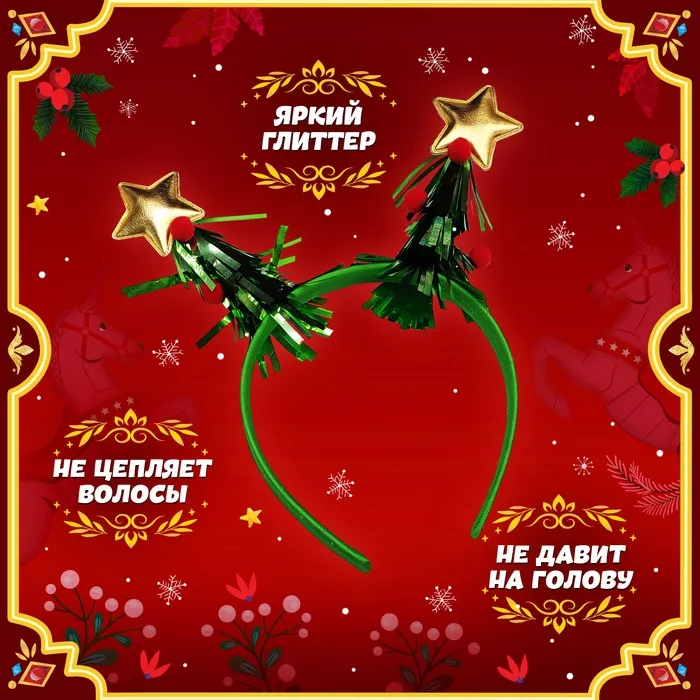 - Ободок: Яркий зелёный ободок украшен двумя ёлочками с золотыми звёздами. Ободок надёжно фиксируется на голове и не доставляет дискомфорта.