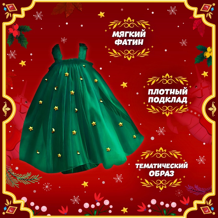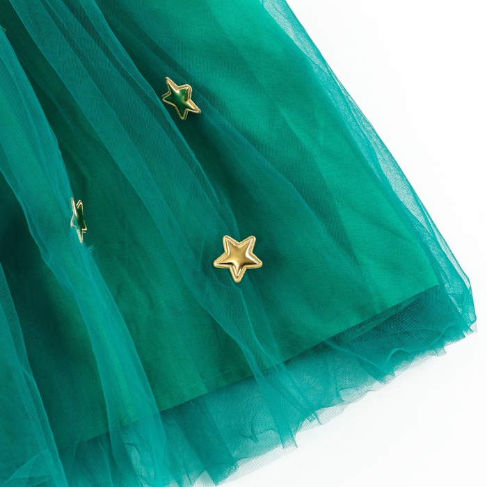 - Платье: Пышное платье изумрудного цвета украшено золотыми звездочками. Платье изготовлено из мягкой и приятной к телу ткани, что обеспечивает комфорт ребёнку во время праздника.
