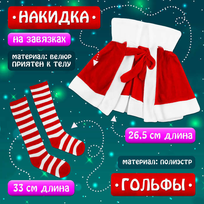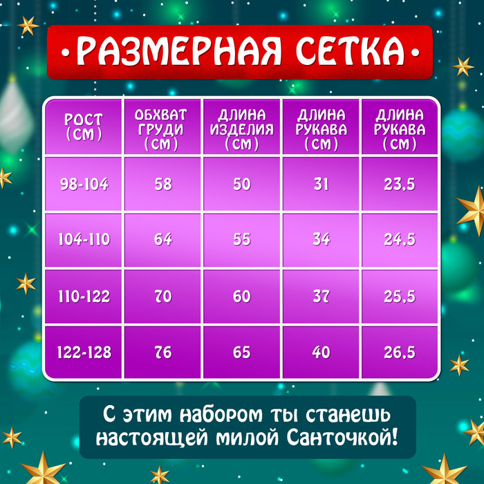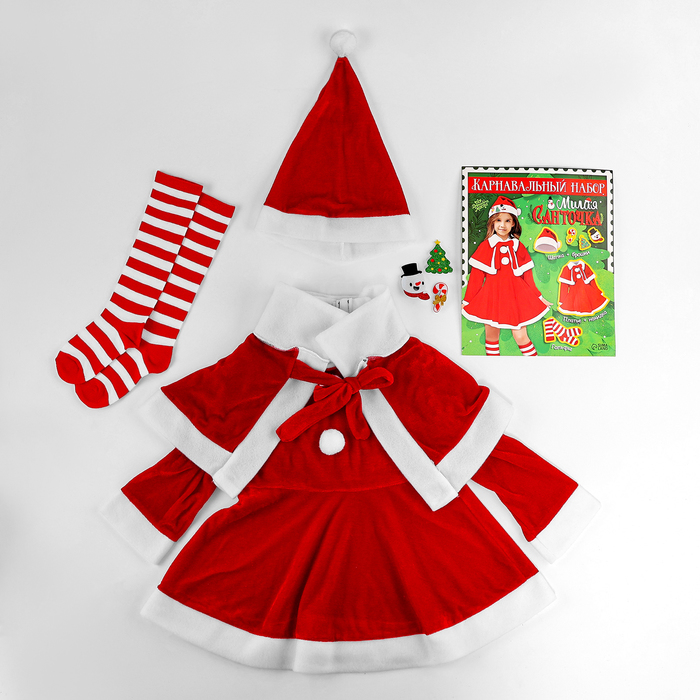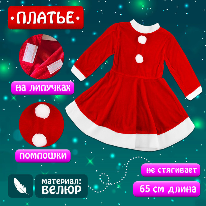 Карнавальный костюм новогодний «Милая Санточка»: платье, накидка, колпак, ремень, брошки, рост 122-128 см — Характеристики