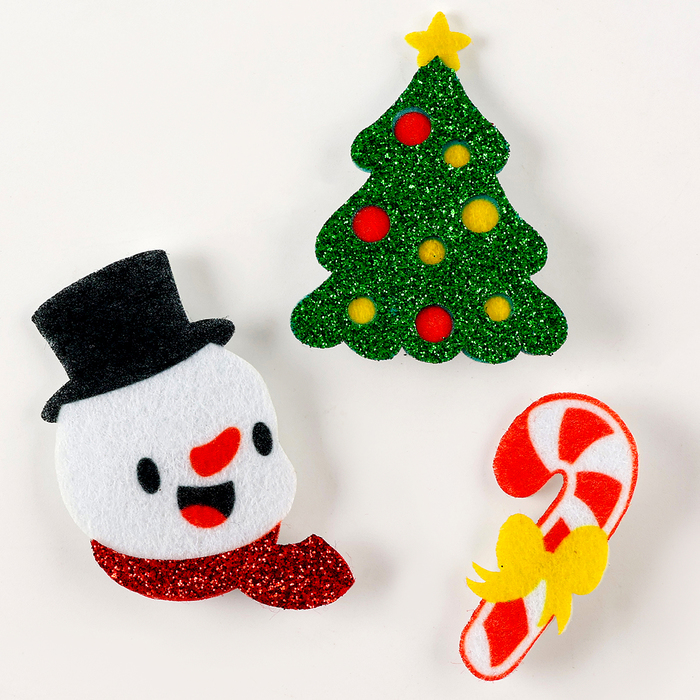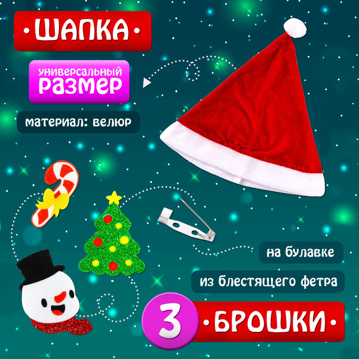 - Набор из трёх ярких брошей с новогодней тематикой. Их можно прикрепить к платью или шапке для создания индивидуального образа.