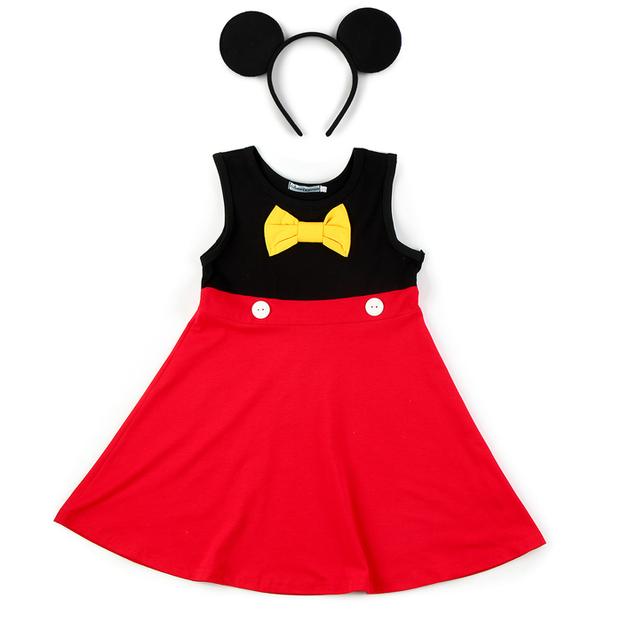 - Верх платья выполнен из черной ткани, а юбка – из яркой красной. Материал хорошо тянется и при этом обладает легким блеском. Благодаря натуральному составу, в платье будет комфортно даже при активных играх.