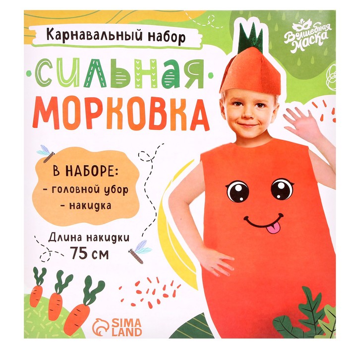 С набором «Сильная морковка» ваша малышка станет настоящей звездой на детской вечеринке и поразит всех гостей! С ним вы составите полноценный образ, ведь в комплекте есть накидка и головной убор. Создавайте яркие эмоции и воспоминания на целый год вперёд себе и ребёнку!