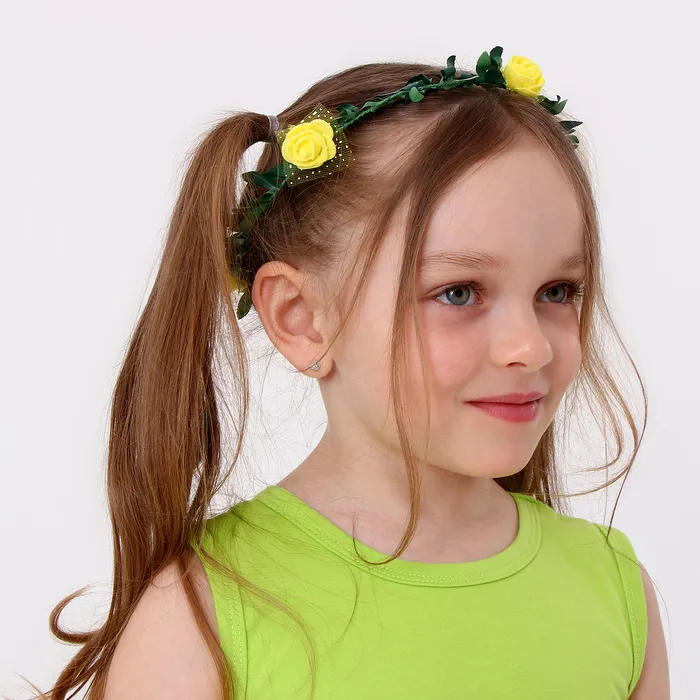 - Венок с жёлтыми цветами добавляет нежности и завершает образ, позволяя ребёнку почувствовать себя настоящей сказочной героиней.