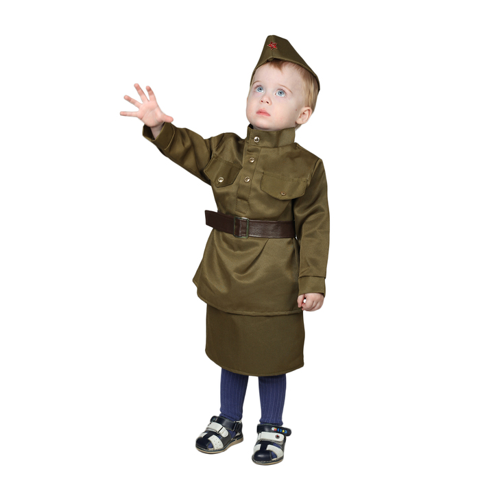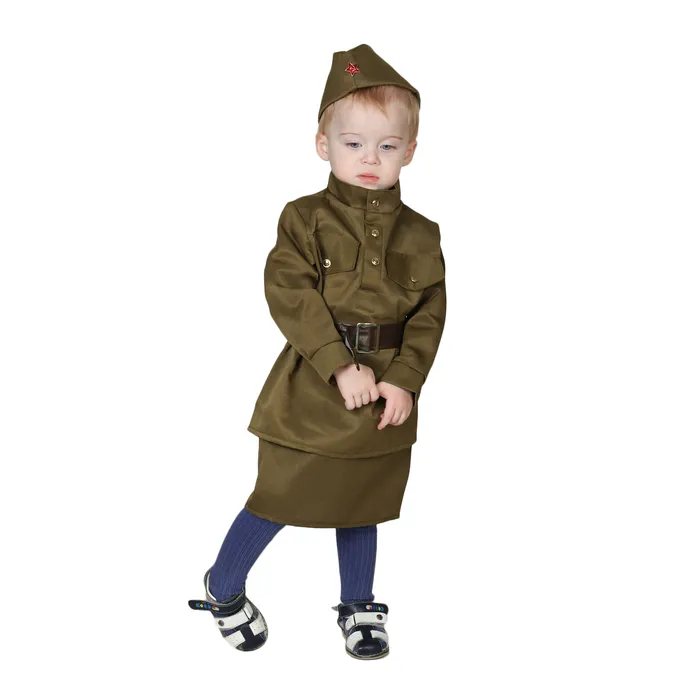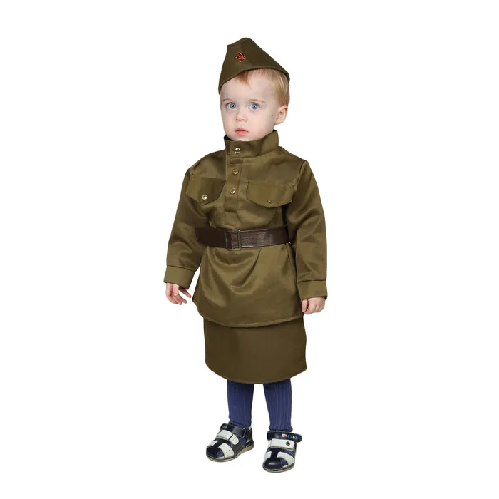 Карнавальный костюм «Солдаточка», пилотка, гимнастёрка, ремень, юбка, 2-3 года, рост 94-104 см превратит вашу крошку в отважную военнослужащую! Наряд из полиэстера и хлопка обеспечивает идеальную посадку и не сковывает движений. В нём маленькая леди без труда исполнит танец.