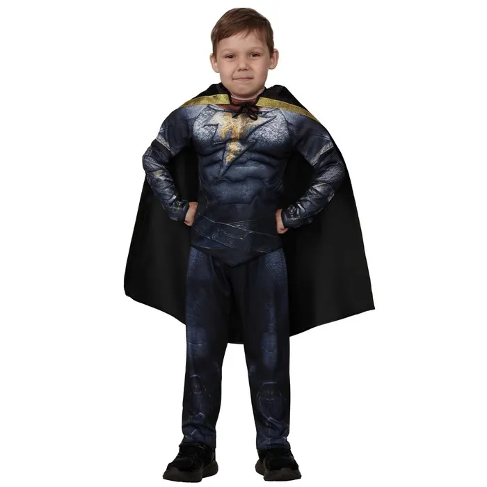 Карнавальный костюм Чёрного Адама создан для маленьких супергероев, готовых перевоплотиться в мощного и таинственного персонажа из комиксов. Крой наряда позволяет ему красиво и комфортно сидеть по фигуре.