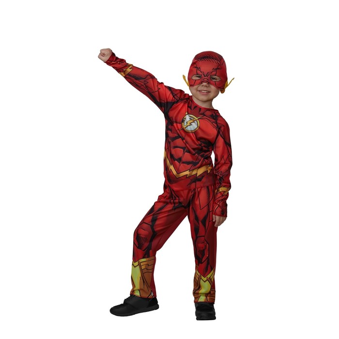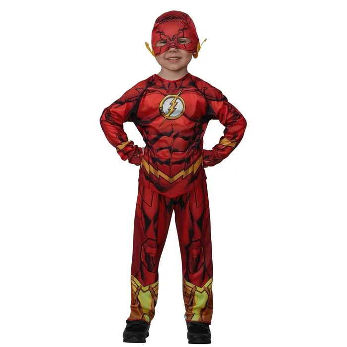 Красочный костюм, вдохновленный персонажем Флэша из комиксов, станет отличным выбором для разных праздников и мероприятий. Костюм выполнен в красно-желтой цветовой гамме, привлекающей внимание своей яркостью и оригинальностью. На материале нанесен рисунок, имитирующий мускулы, а на груди изображен знаменитый логотип в виде молнии.