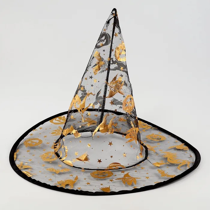 - Шляпа с прозрачной тульей и широкими полями украшена золотым принтом. Такой головной убор станет изюминкой костюма.