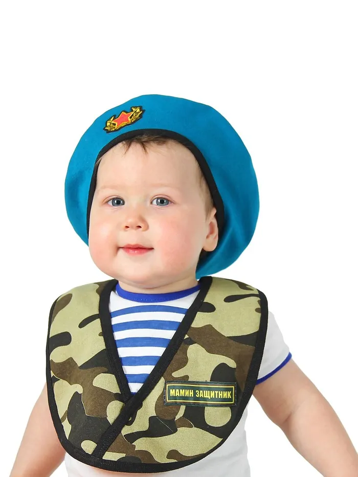 Мягкие варежки защитят чувствительную кожу малыша от холода и ветра, а нагрудник позволит крохе не испачкаться. Головной убор дополнит облик маленького защитника. А вы испытаете гордость за подрастающего патриота!
