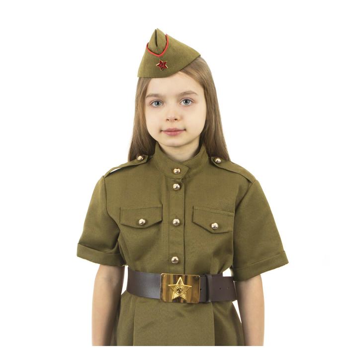 Карнавальный костюм военного: платье с коротким рукавом, пилотка, р-р 38, рост 146-152 см превратит юную леди в отважную военнослужащую! Платье стилизовано под военную форму времён Второй мировой войны. Высококачественный материал (хлопок 50 %, полиэстер 50 %) обеспечивает идеальную посадку и не сковывает движения. Танец, исполненный в таком платье, будет особенно трогательным. Костюм идеально подойдёт к любому военному празднику и поможет воспитать у девочки патриотические чувства.