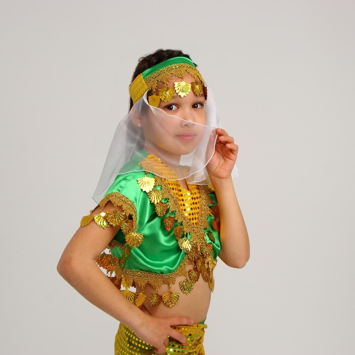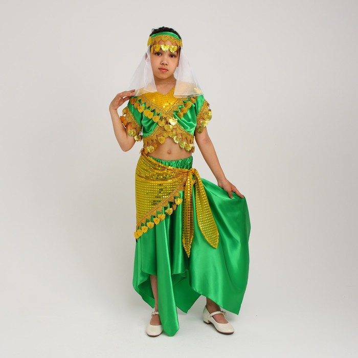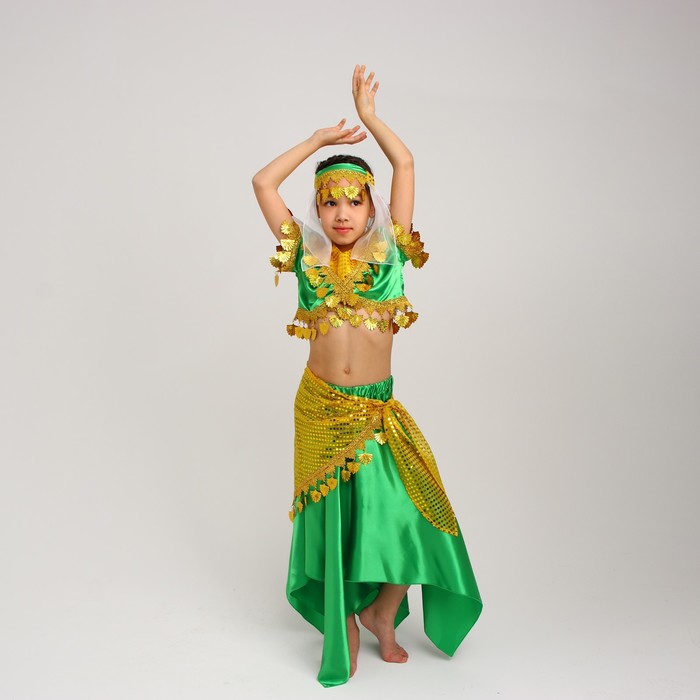 Карнавальный костюм восточной танцовщицы для девочки — это стильный наряд, который подходит для праздников, выступлений и тематических мероприятий. Комплект включает блузку, юбку, косынку и повязку, создавая яркий образ восточной принцессы в зелёно-жёлтых оттенках.