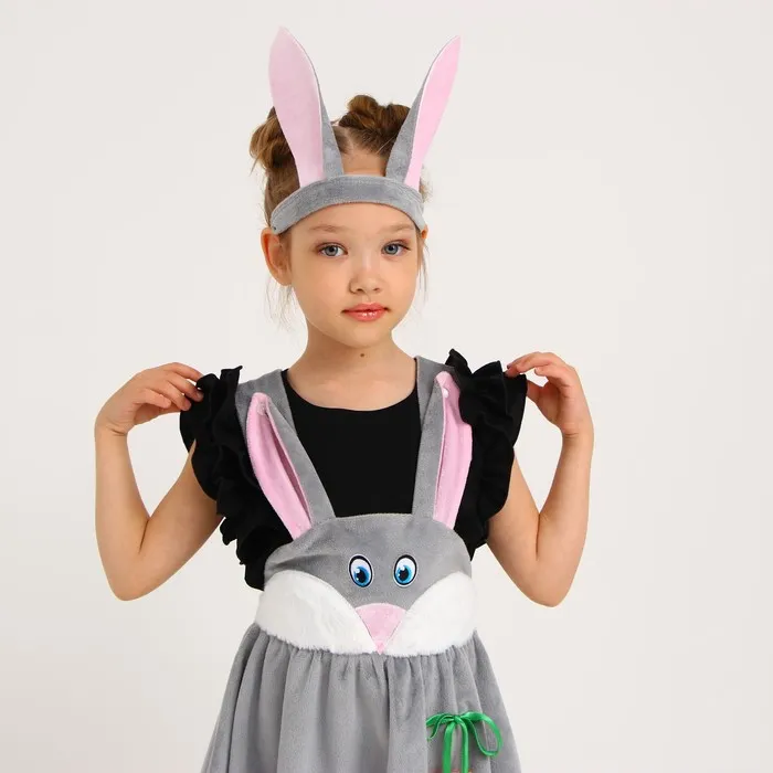 Костюм изготовлен из мягкого плюшевого материала приятного на ощупь. Детали, такие как мордочка зайки на сарафане и ушки на повязке, добавляют нарядности и веселья в образ.