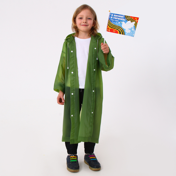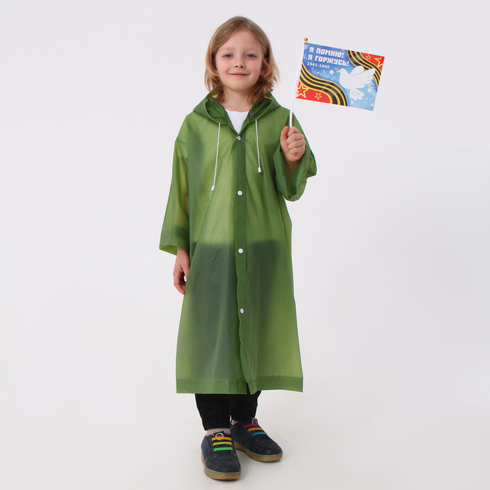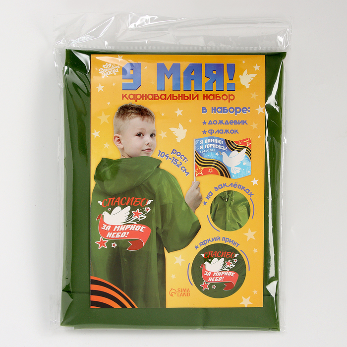 Карнавальный набор, посвященный 9 мая, включает в себя два элемента: дождевик с капюшоном и флажок. Этот набор идеально подходит для праздничных мероприятий, позволяя выразить поддержку и уважение к значимому дню в истории страны.