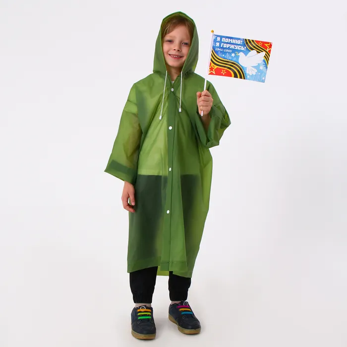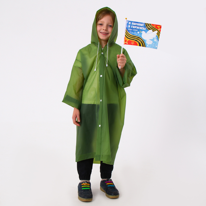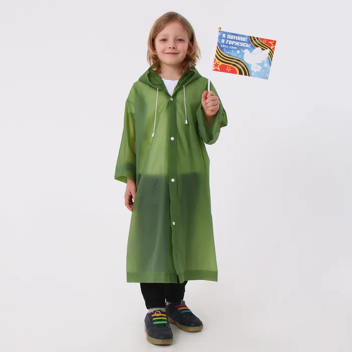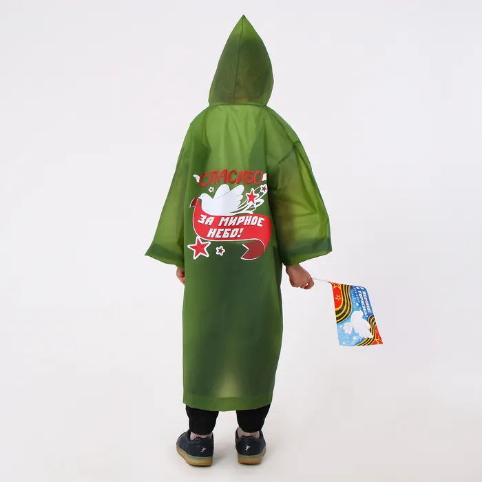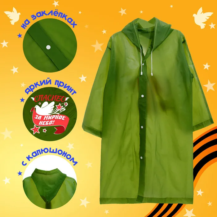 Этот набор будет уместен на различных мероприятиях, посвященных Дню Победы, таких как парады, митинги, шествия или просто праздничные прогулки. Дождевик защитит от непогоды, а флажок поможет выразить уважение и память о событиях, связанных с этим днем. Набор также можно использовать в качестве тематического аксессуара на карнавальных вечеринках или в образовательных мероприятиях, посвященных историческим событиям.