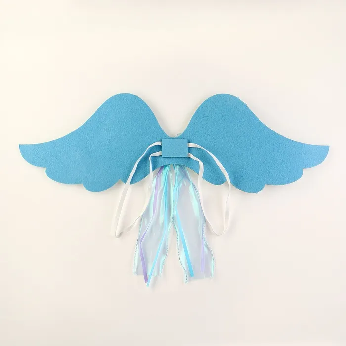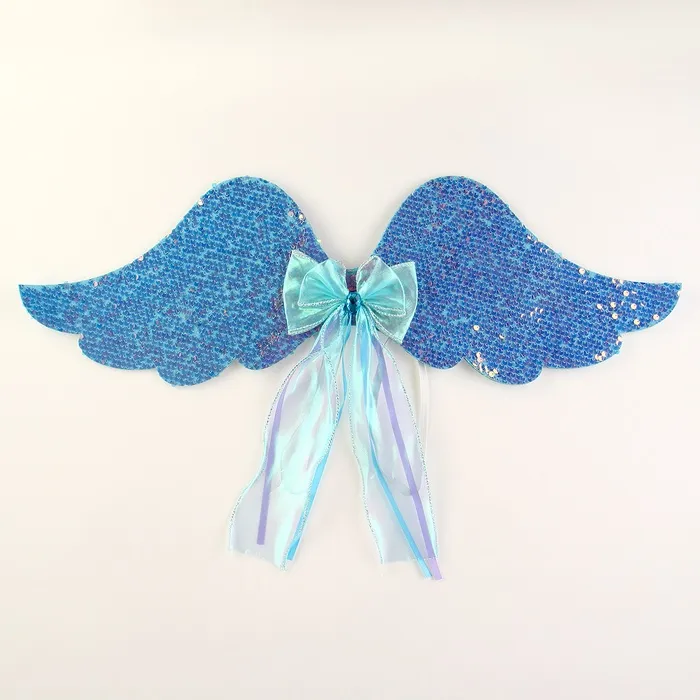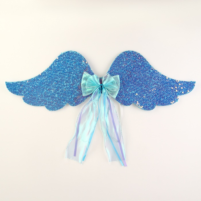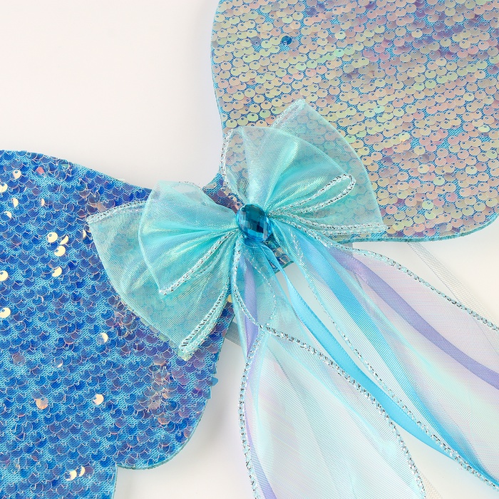 - Крылья — это настоящая изюминка набора. Они покрыты мерцающими пайетками, которые переливаются на свету, создавая эффект волшебства. Крылья украшены пышным голубым бантом с блестящим стразом, придающим образу дополнительную изысканность. Крылья оснащены резинкой, чтобы их было удобно надевать.