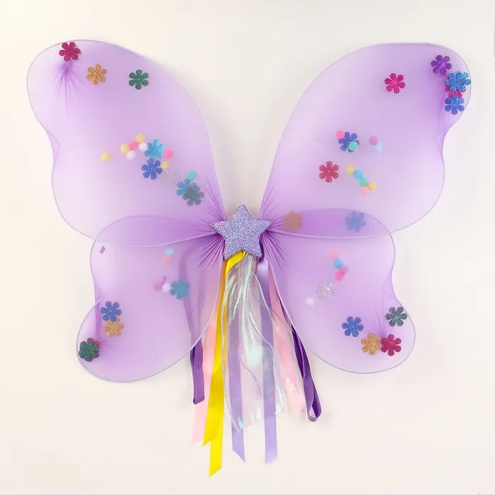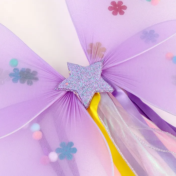 - Крылья — это изюминка костюма. Они изготовлены из яркого фиолетового материала, украшены цветочками и сверкающей звездой с нежными лентами. Крылья надёжно фиксируются на плечах с помощью резинок, обеспечивая комфорт и свободу движений.